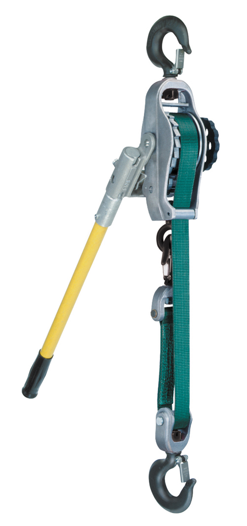 Includes Hot Stick Rings on All Hooks and Control Surfaces. Overload Protection handle bends to warn of hazardous condition and prevents dangerous overload. 360° swiveling hooks equipped with latches for positive load engagement. Positive load holding in all environments. Double, interlocking pawl mechanism assures one pawl is engaged at all times. Lightweight & Rugged cast aluminum and zinc alloy housings. Corrosion Resistant stainless steel springs and shafts. Reduced Wear through rotating shafts are mounted on bronze bushings. Meets or exceeds minimum 4:1 design factor and all requirements of ASME/ ANSI Standard B-30.21. All units tested at 125% of rated load.